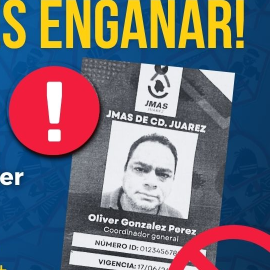 La J+ alerta a la ciudadanía sobre una persona, que dice llamarse Oliver González Pérez, quien con un gafete falso pretende hacerse pasar como empleado de la Junta de Agua y Saneamiento de Juárez y solicita ingresar a los domicilios argumentando que va a atender reportes levantados ante este organismo.
