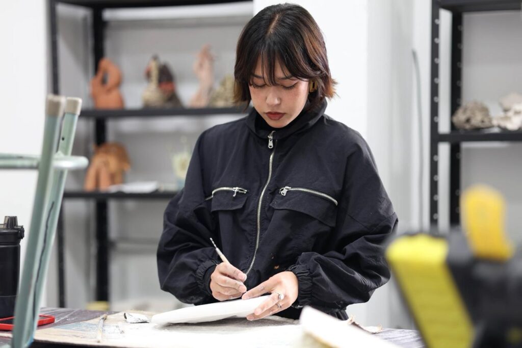 Fue dentro de ese entorno donde encontró algo que marcaría su decisión: convivir con otras personas dedicadas a la creación. Estar rodeada de pintura, materiales y procesos artísticos le permitió reconocer cómo se sentía al formar parte de ese ambiente y entender que el arte sería su forma de vida.