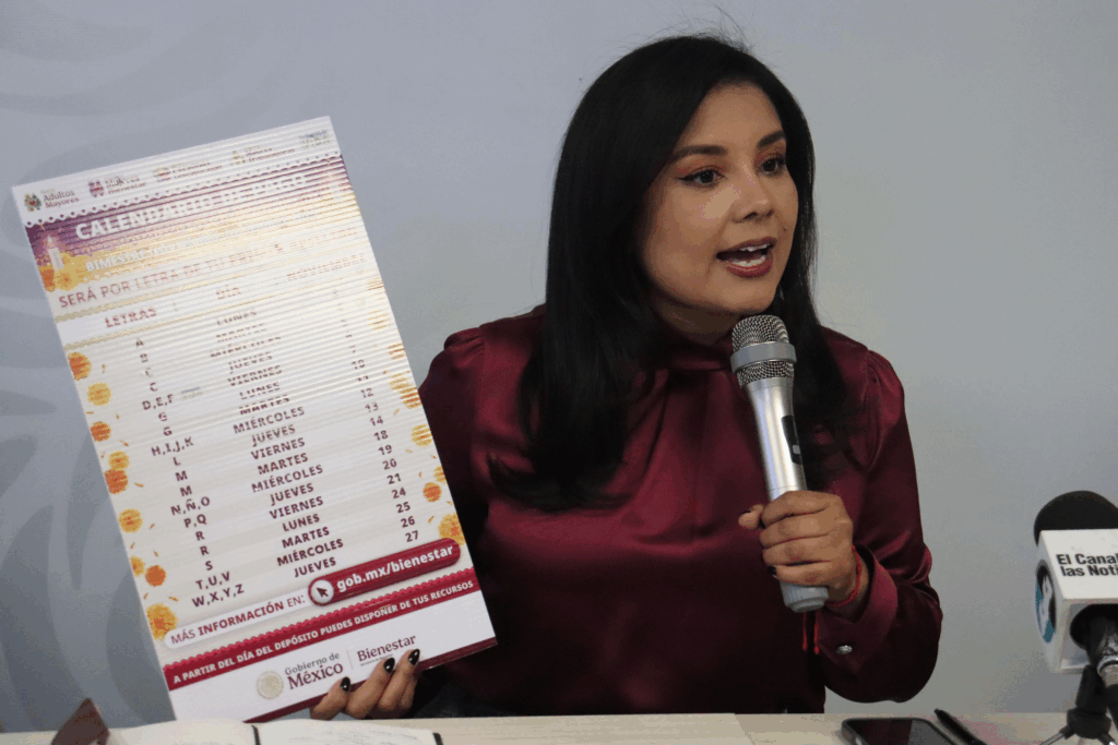La delegada estatal de Programas para el Bienestar en Chihuahua, Mayra Chávez Jiménez, en rueda de prensa, dio a conocer el calendario de pagos de las Pensiones y programas de Bienestar del Gobierno de México, correspondientes al bimestre noviembre-diciembre, inicio el lunes 3 de noviembre y culmina el jueves 27 del mismo mes.