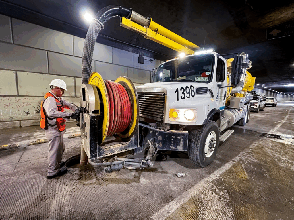 Por instrucciones del director ejecutivo de la Junta de Agua y Saneamiento de Juárez, Sergio Nevárez, personal del Departamento de Alcantarillado realizó labores de limpieza en el túnel de la avenida 16 de Septiembre, con la finalidad de extraer el agua acumulada tras las recientes lluvias y permitir el paso seguro de los automovilistas.