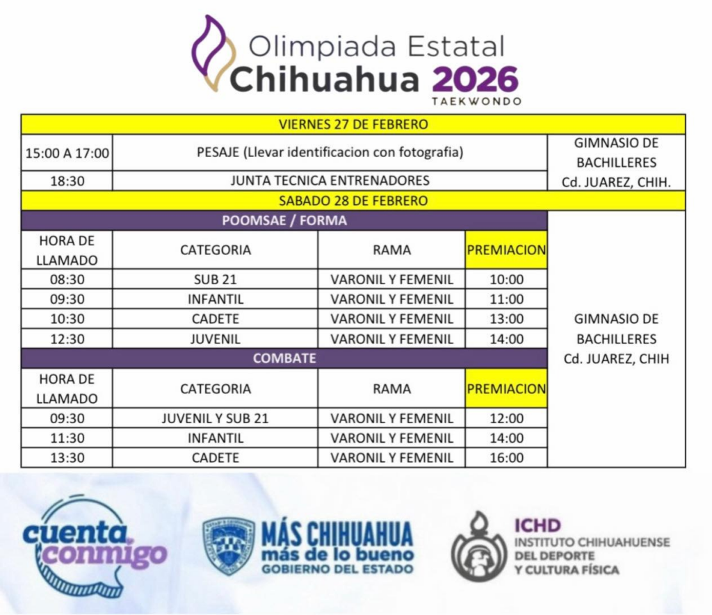 Este sábado 25 de febrero se llevará a cabo el tercer serial estatal de taekwondo, donde artemarcialistas de todo el estado, buscarán su lugar en el selectivo que representará a Chihuahua en el Regional CONADE 2026.