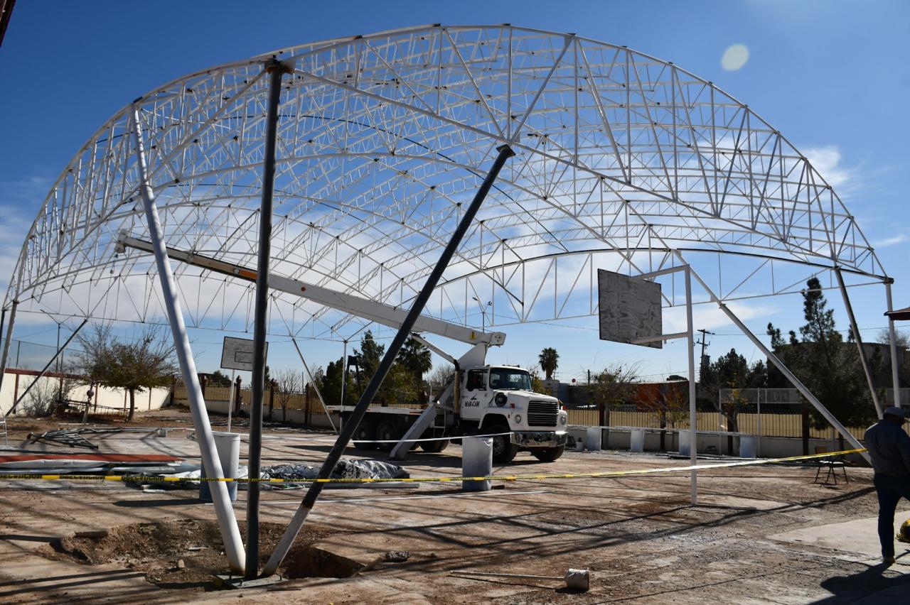 La Dirección General de Obras Públicas trabaja en la construcción de un domo en la Escuela Primaria Ramona Soto de González, ubicada en las calles Benemérito de las Américas, de la colonia Infonavit Casas Grandes.