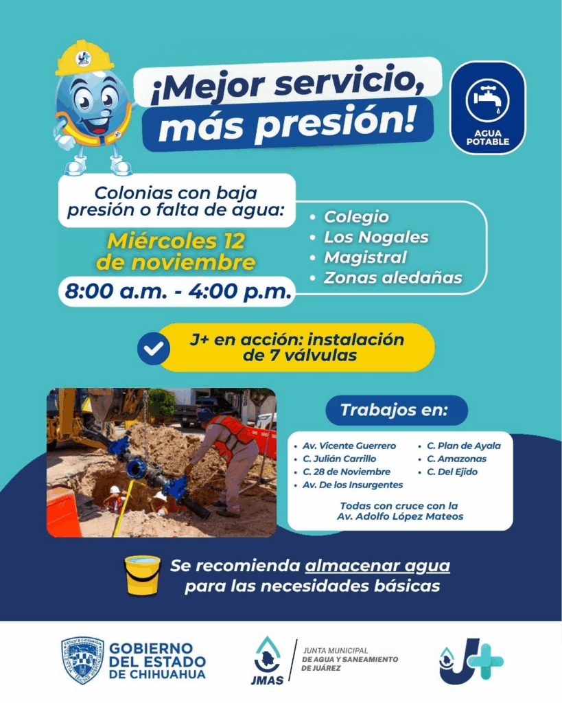 Este miércoles 12 de noviembre, el Departamento de Eficiencia Física de la Junta de Agua y Saneamiento de Juárez, instalará 7 válvulas de seccionamiento, como parte de las acciones de sectorización del distrito 5.
