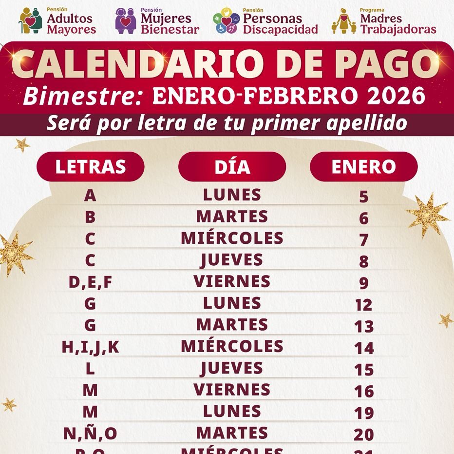 Ariadna Montiel agregó que, la fecha de pago, se puede consultar en la página oficial de la Secretaría de Bienestar: gob.mx/bienestar. Para brindar mejor atención, el depósito bancario se realiza de acuerdo con la letra del primer apellido de las beneficiarias, bajo el siguiente calendario: