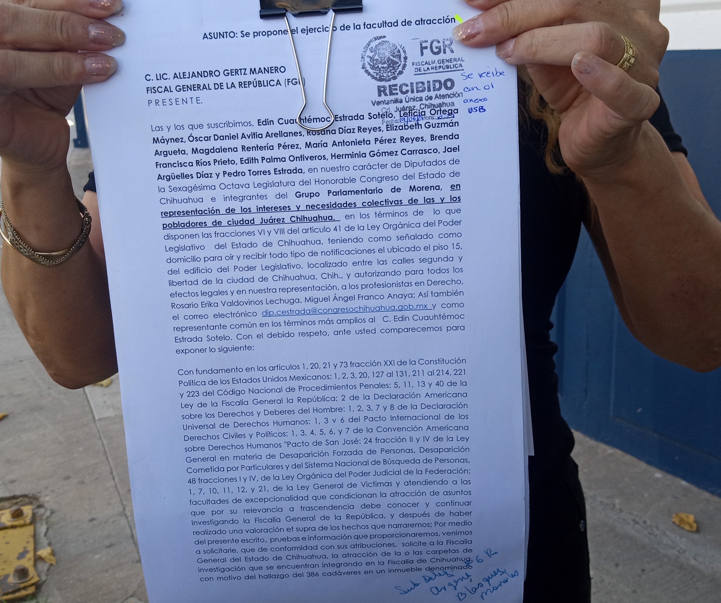 Las legisladoras entregaron una petición formal al delegado de la FGR en Chihuahua, Ramón Vadillo, acompañada de pruebas documentales y del marco jurídico que, según señalaron, faculta a la dependencia federal a atraer casos de relevancia extraordinaria para la sociedad.