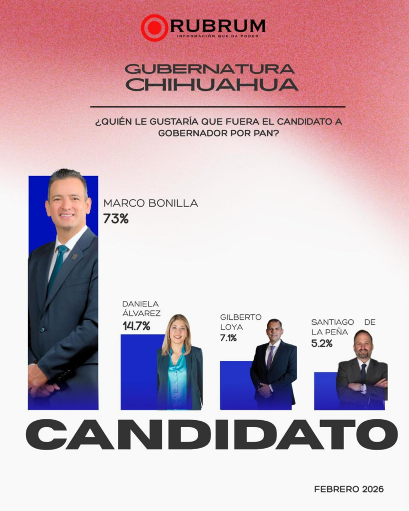 El alcalde de Chihuahua Marco Bonilla, está al frente de las preferencias ciudadanas con respecto a las candidaturas a la gubernatura rumbo al 2027 por el PAN de acuerdo a la última evaluación de la casa encuestadora RUBRUM.