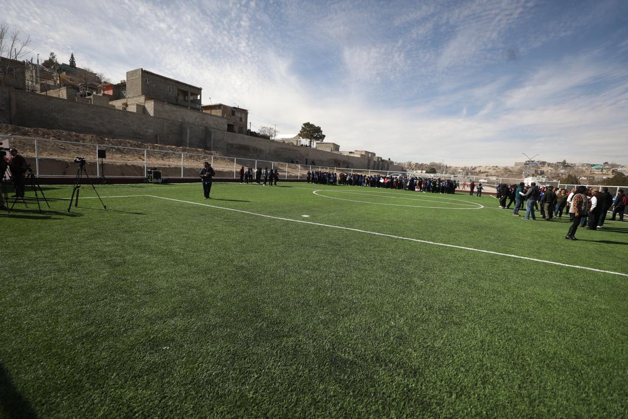 La obra en la Técnica 56 incluye una cancha de fútbol de 30 por 45 metros, con pasto sintético, enrejado perimetral, casetas para jugadores y gradas metálicas con tejabán, lo que representa una inversión de 2 millones 789 mil pesos.
