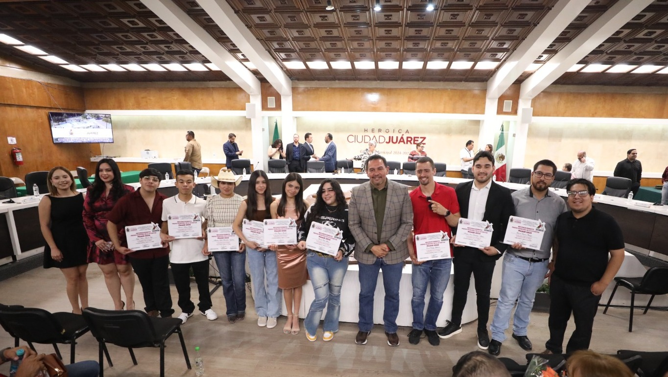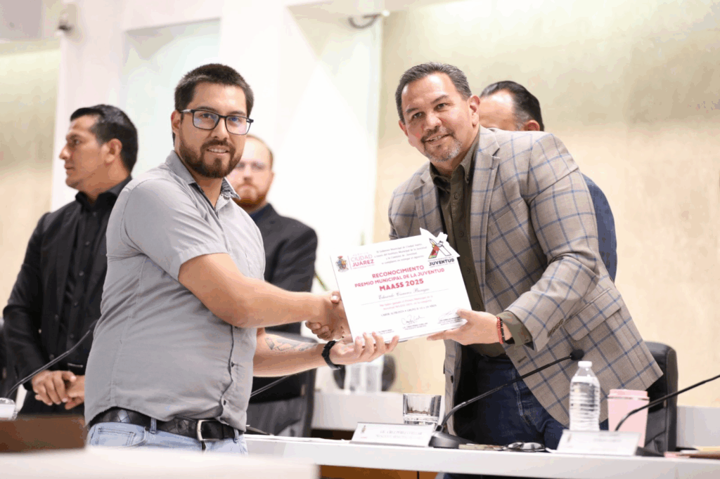 El Presidente Municipal, Cruz Pérez Cuéllar entrega del Premio Municipal de la Juventud MAASS 2025 a los juarenses que destacan en actividades académicas, artísticas, productivas y deportivas, así como por su labor altruista.
