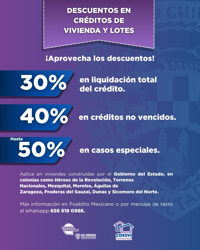 Con el objetivo de beneficiar a las familias juarenses, el Gobierno del Estado, a través de la Comisión estatal de Vivienda, Suelo e Infraestructura (Coesvi), extendió todo el año el programa de descuentos para el pago de créditos en lotes y viviendas.