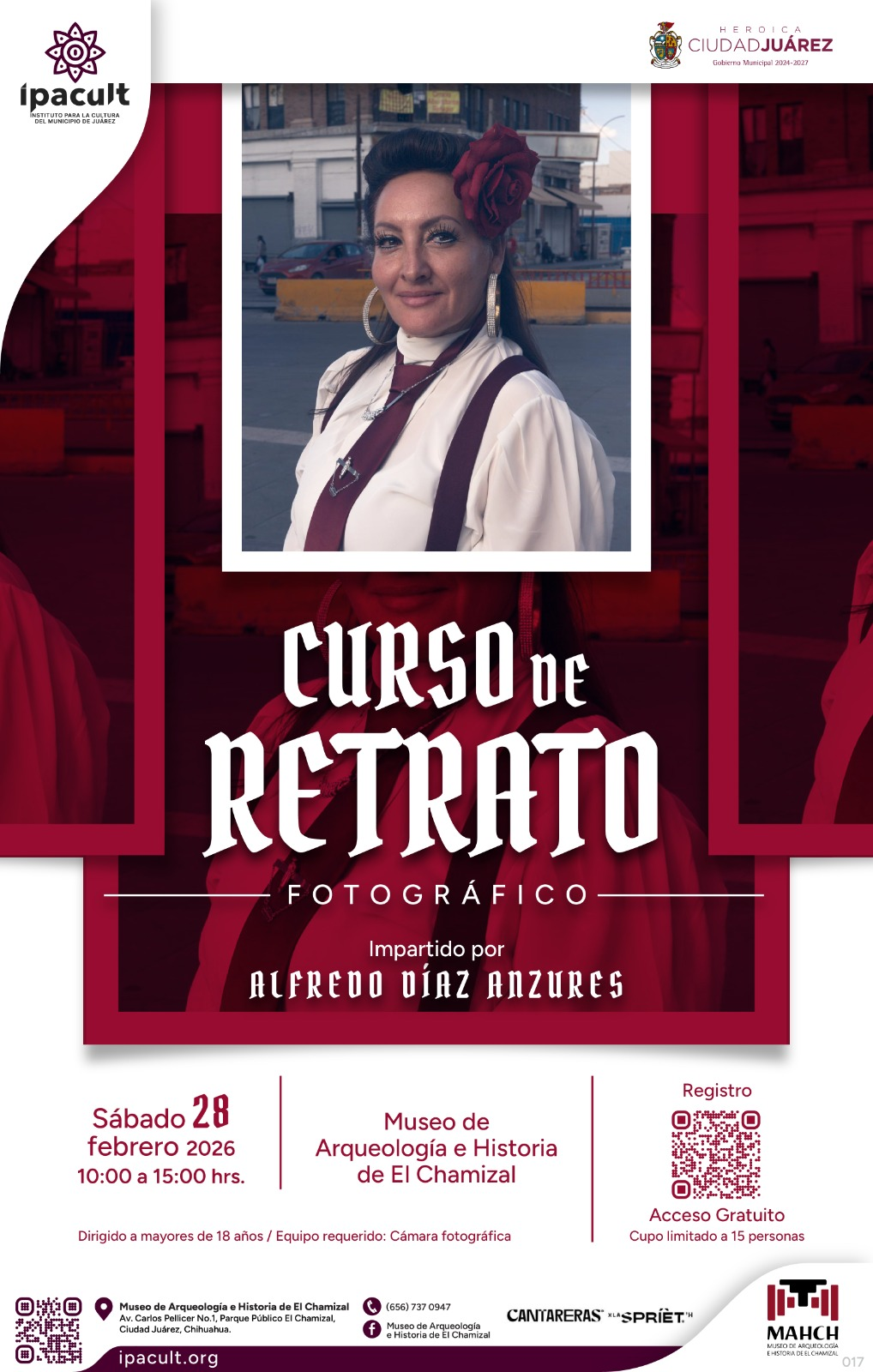 El Instituto para la Cultura del Municipio de Juárez invita a la comunidad a participar en el Curso de Retrato que será impartido por el fotógrafo Alfredo Díaz Anzures, el próximo sábado 28 de febrero a las 10:00 de la mañana, en el Museo de Arqueología e Historia de El Chamizal.