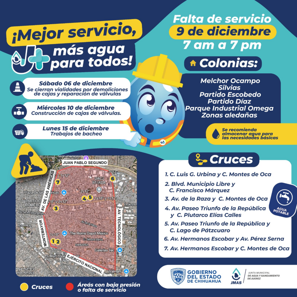 A partir de este sábado 6 de diciembre, la Junta de Agua y Saneamiento de Juárez inicia un operativo de sustitución de válvulas en la zona baja de la ciudad, para mejorar el suministro de agua potable y la operación de la red hidráulica en beneficio de 20 mil familias juarenses.