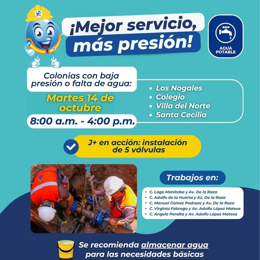 Por estas acciones, se impactará la prestación del servicio en los fraccionamientos: Los Nogales, Colegio, Villa del Norte, Santa Cecilia y zonas aledañas.