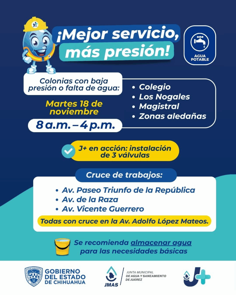 Mientras que el día martes 18 de noviembre, se llevará a cabo la instalación de 3 válvulas de seccionamiento en las calles: Avenida Paseo Triunfo de la República, Avenida de la Raza y Vicente Guerrero, todos con cruce con Avenida Adolfo López Mateos.