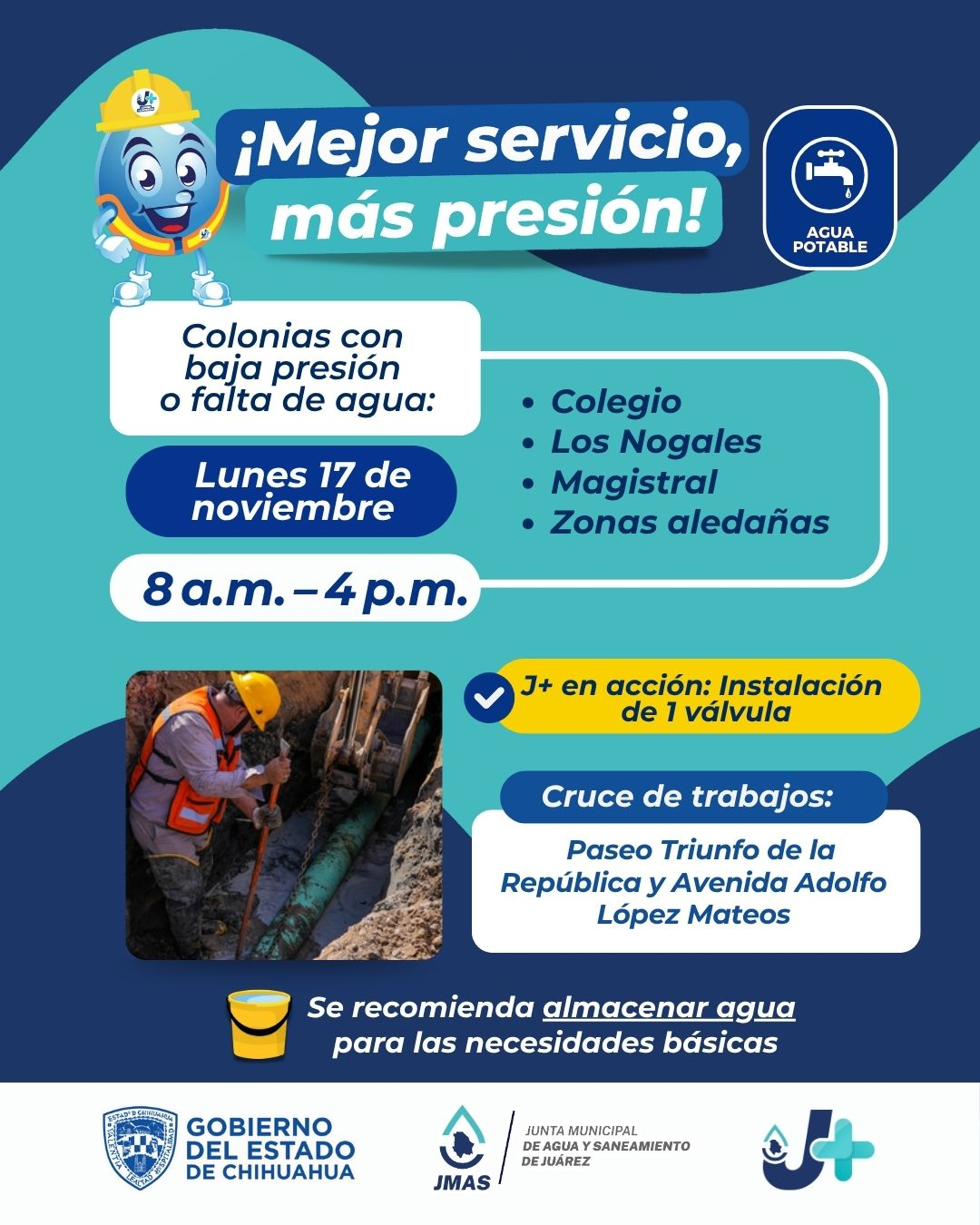 Derivado de estos trabajos de instalación de válvulas nuevas, se verá afectado el servicio en un horario de 8:00 a 16:00 horas, en las colonias Colegio, Los Nogales, Magistral, esperando terminar en el menor tiempo posible para restablecer el servicio inmediatamente.