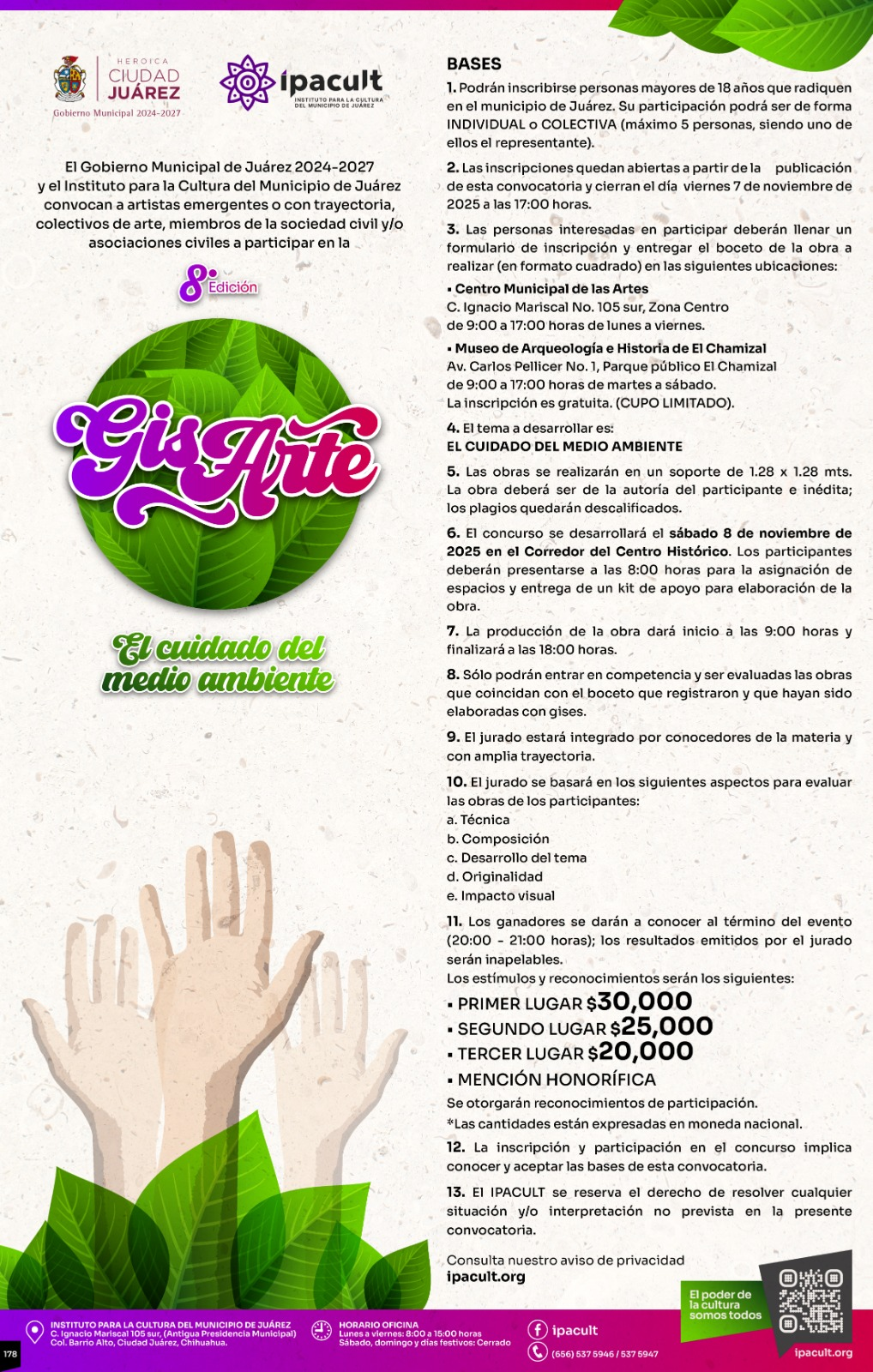 Para conocer las bases completas, el aviso de privacidad y más detalles, los interesados pueden visitar ipacult.org o la página de Facebook del Instituto para la Cultura del Municipio de Juárez.