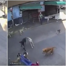 La señora cae al suelo y es mordida por varios perros de la jauría, lo cuál la hace gritar de dolor, momento en el que es ayudada por un hombre, quien trata de correr a los perros y levantar a la mujer.