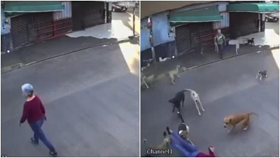 En el video, se puede ver el momento en que la señora va caminando tranquilamente por la calle, cuando de la nada al menos 21 perros salen corriendo desde la esquina para interceptar a la señora.