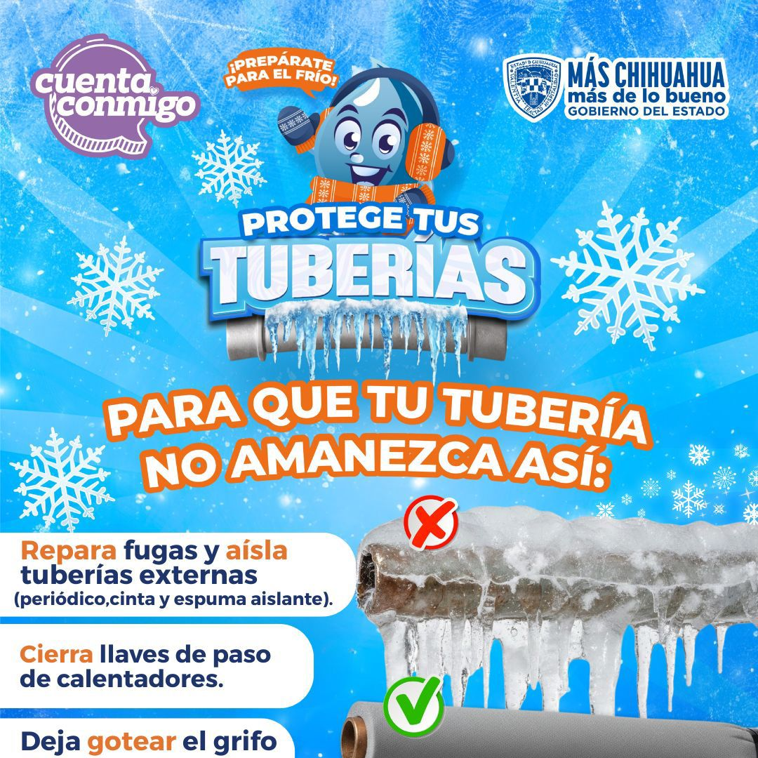 Ante la alerta de bajas temperaturas, la Junta de Agua y Saneamiento de Juárez exhorta a la ciudadanía a tomar precauciones en sus hogares y comercios para evitar fugas de agua ocasionadas por el congelamiento de las tuberías.