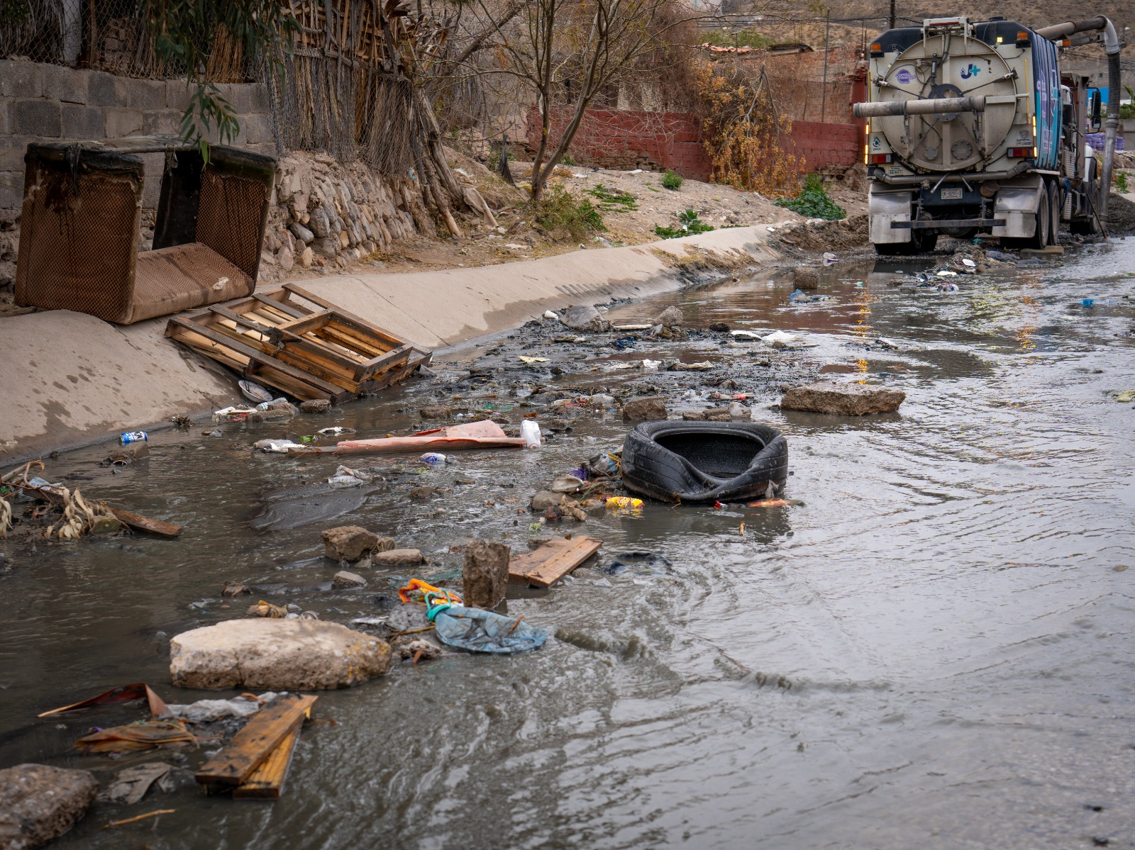 Este martes la Junta de Agua y Saneamiento de Juárez (J+) realizó mantenimiento en el sistema de alcantarillado en Arroyo del Muerto, conocido como «El Tapo», ubicado en la colonia Ampliación Felipe Ángeles, ya que las alcantarillas que se encuentran sobre el arroyo, al no contar con la pavimentación correspondiente, se llenan de piedra, basura y desperdicios, por lo cual fueron necesarios estos trabajos para que no presente problemas futuros.
