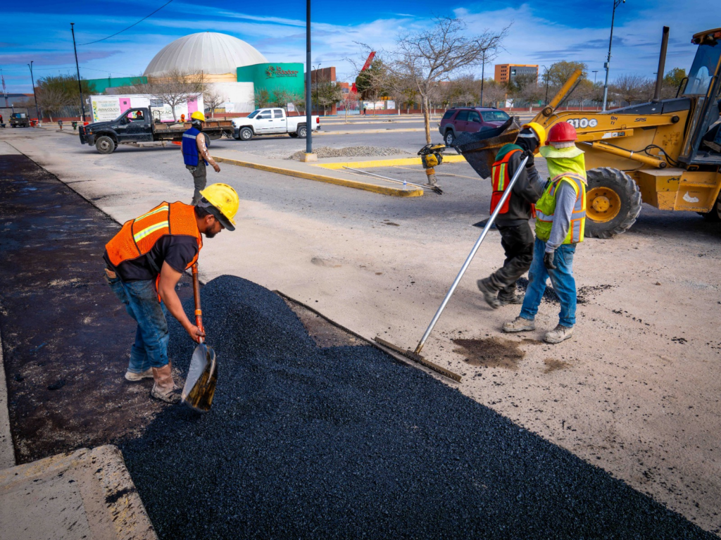El Departamento de Bacheo de la J+, supervisa las labores en las que participan más de 20 personas, apoyadas con maquinaria especializada, con el objetivo de concluir 175 metros de pavimentación en el estacionamiento de empleados del Parque Central Poniente, así como aproximadamente 25 metros de concreto sobre la calle Jesús Soltero Lozoya.