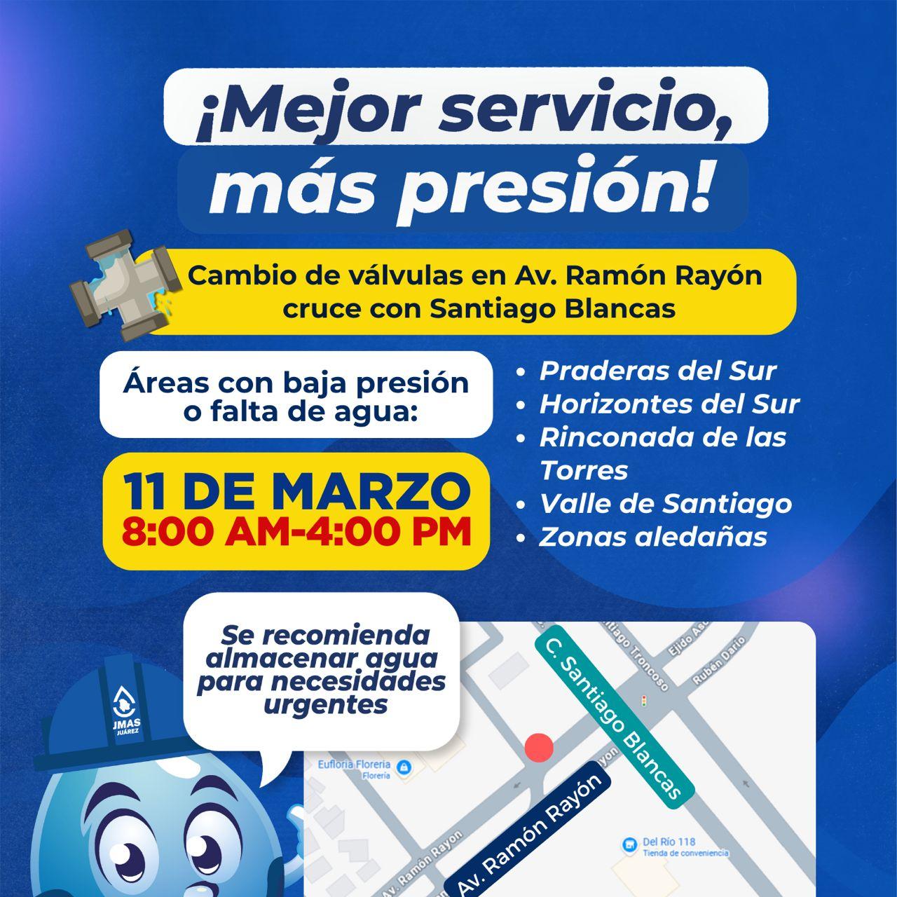 Las válvulas actuales concluyeron su vida útil, por lo que serán reemplazadas, la intervención será de las 8 de la mañana a las 4 de la tarde, en el cruce de la avenida Ramón Rayón y Santiago Blancas, por lo que, se exhorta a los ciudadanos a tomar precauciones.
