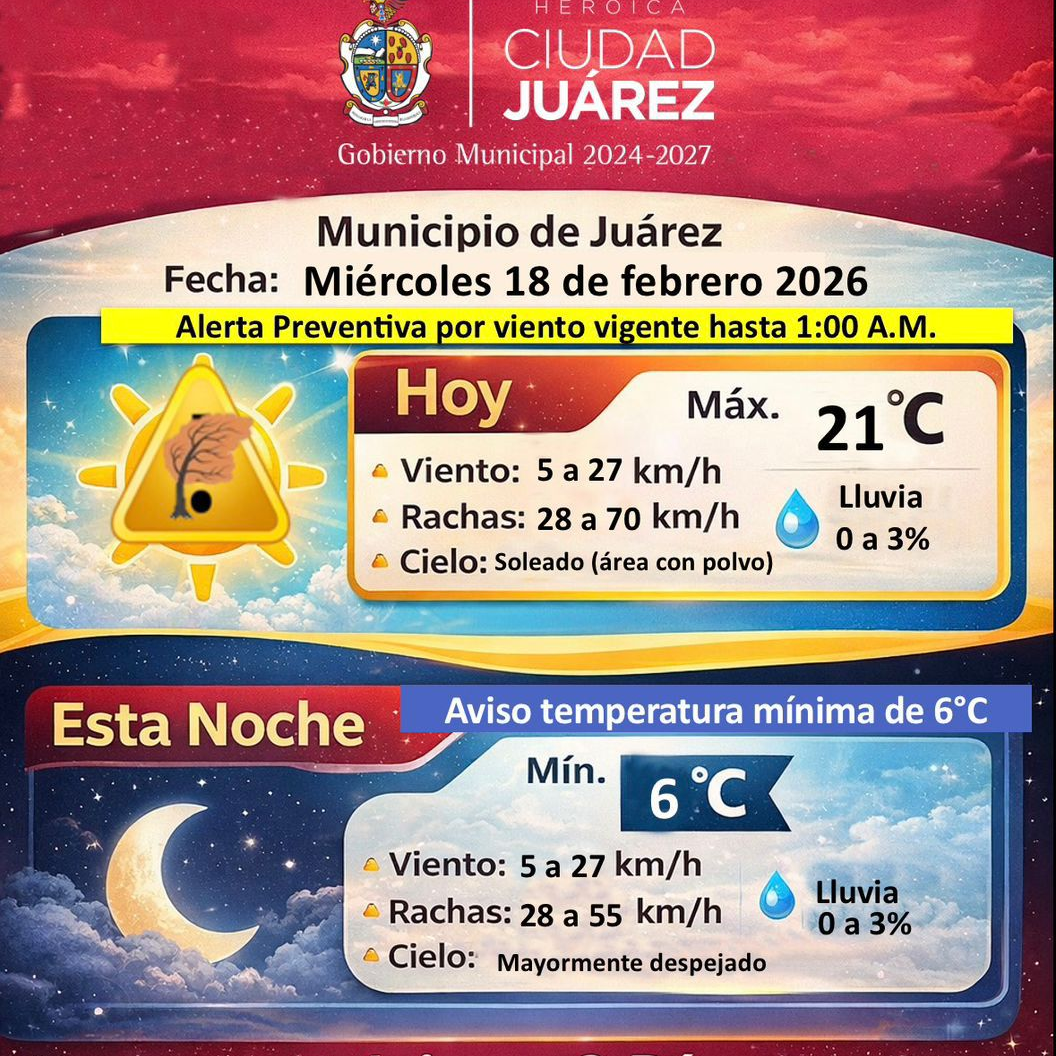 La Dirección General de Protección Civil del Gobierno Municipal, informó que este miércoles 18 de febrero se mantiene vigente la alerta preventiva por viento hasta la 1:00 de la madrugada.