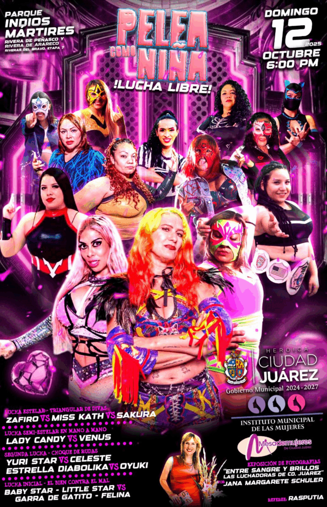 Además, previo a la función se ofrecerán otras actividades como la venta de alimentos y bebidas, y la presentación de la exposición fotográfica “Entre sangre y brillos: Las luchadoras de Cd. Juárez”, de la autora Jana Margarete Schuler.