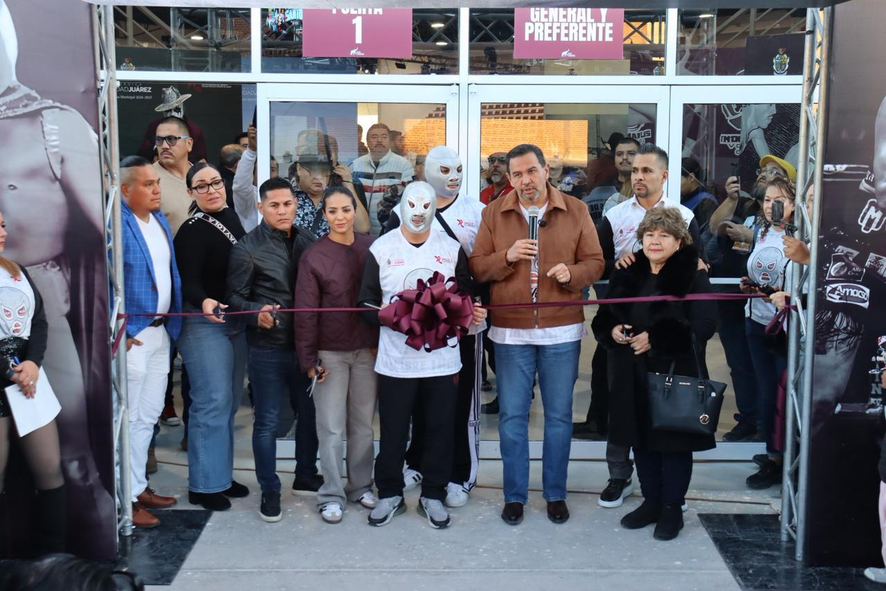 El Presidente Municipal, Cruz Pérez Cuéllar, junto con miles de juarenses, acudió al remodelado Gimnasio Municipal Josué Neri Santos para acompañar al Hijo del Santo en su gira de despedida de los cuadriláteros.