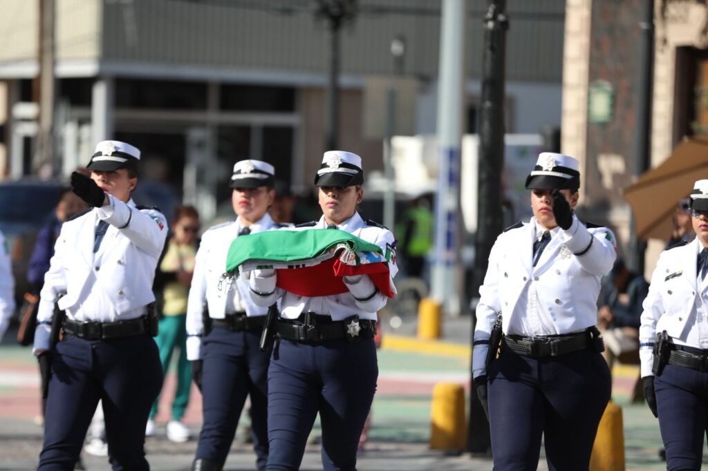 Los honores estuvieron a cargo de la escolta y banda de guerra de la Secretaría de Seguridad Pública Municipal, con el acompañamiento de la banda de música del Municipio dirigida por Rafael Mendoza.