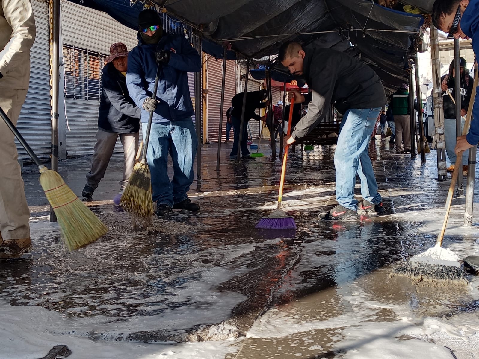 Desde antes de iniciar las ventas, los comerciantes tomaron sus escobas y jabón, mientras que la pipa de la Dirección General de Servicios Públicos arrojó agua tratada para empezar la limpieza.