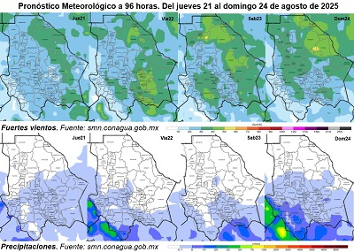 También en Allende, López, Coronado, Jiménez, San Francisco de Conchos, Camargo, La Cruz, Coyame, Ojinaga y Manuel Benavides; en partes de las zonas oeste y centro, como Bachíniva, Guadalupe y Calvo, Moris, Ocampo, Batopilas, Guachochi y Ahumada las precipitaciones serán aisladas.