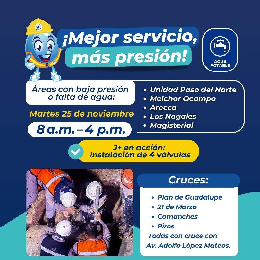 Por estas acciones, habrá suspensión del servicio en los fraccionamientos: Unidad Paso del Norte, Melchor Ocampo, Arecco, Los Nogales, Magisterial y zonas aledañas.