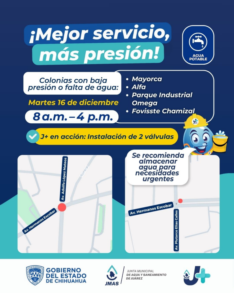 Por estas acciones, habrá suspensión del servicio en las colonias: Mayorca, Alfa, Parque Industrial Omega, Fovisste Chamizal y zonas aledañas.