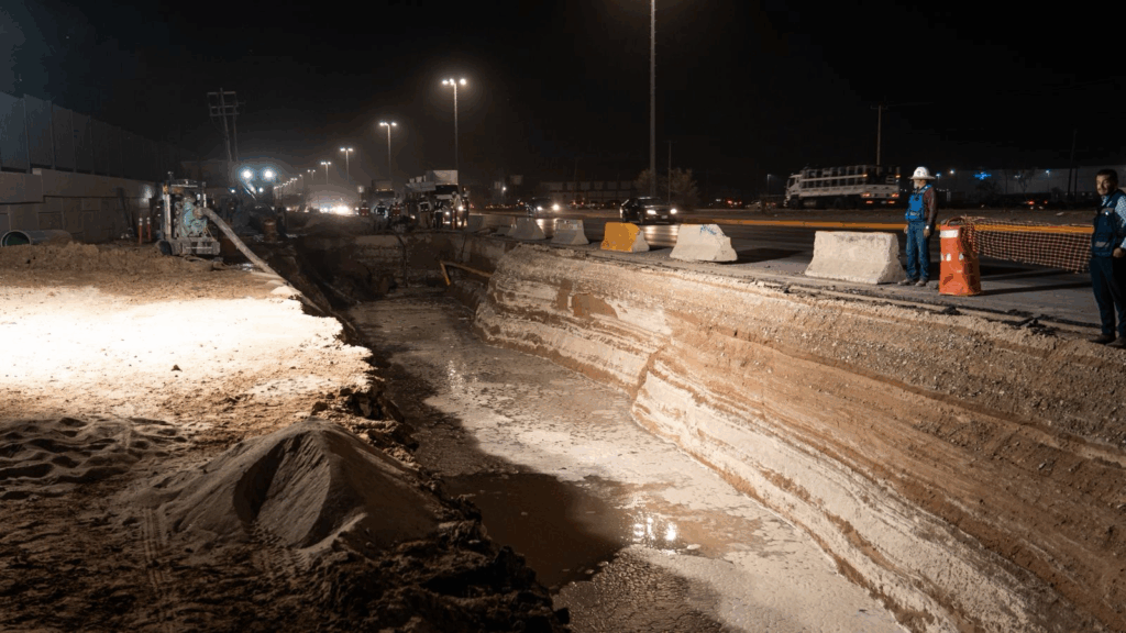 La Junta de Agua y Saneamiento de Juárez, trabaja en la reparación de una fuga registrada en una línea de conducción de 30 pulgadas, ocasionada por una empresa externa, que realizaba labores ajenas al organismo.