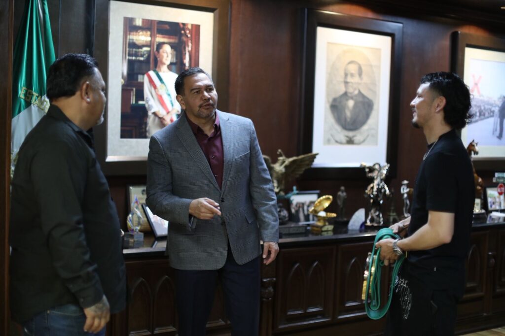 El boxeador juarense Brian Roberto Flores Favela hizo una visita de cortesía al Presidente Municipal, Cruz Pérez Cuéllar, con quien compartió los recientes logros obtenidos en su carrera profesional, entre ellos la conquista del título internacional FECARBOX del Consejo Mundial de Boxeo (CMB).